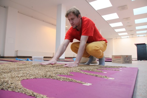 "See on tuttava antud vili, mis on üle kümne aasta seisnud ning mida isegi loomad ja linnud enam ei taha," ütles Kasemets. "Kollaste viljaterade eksponeerimiseks värvisin saepuruplaadid erklillaks."