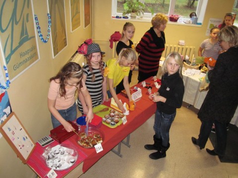 5A klassi tüdrukud Anette, Adele, Brita ja Reneli on oma pika leti täis ladunud lausa kohvikumenüüle sobiva valiku. Soolast pirukad, magusaid muffineid. "Ise küpsetatud," kiidab Anette. Nukutoa sisustus, muu käsitöö. "Kaup läheb päris hästi. Isetehtud seepi oli ka, aga see on juba otsas," seletab ta.