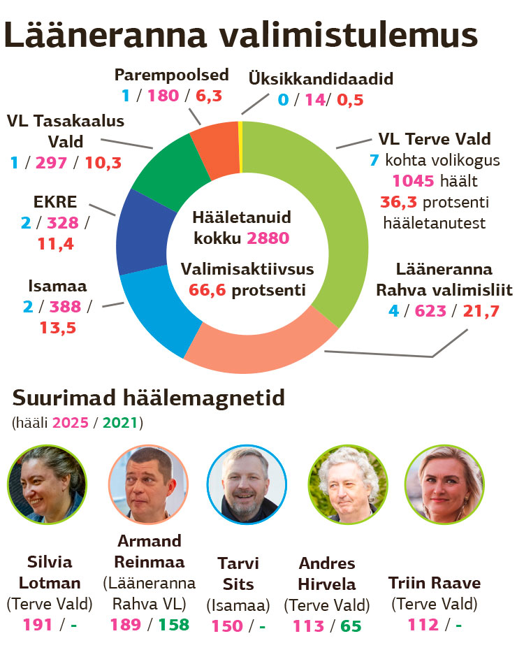 Terve Valla esinumbrile ja tõenäoliselt tulevasele Lääneranna vallavolikogu esimehele Silvia Lotmanile andis hääle 191 valijat. Esimest korda kandideerinud Lotmanist rohkem on Läänerannas hääli saanud vaid kunagine vallavanem Mikk Pikkmets, kelle poolt hääletas 2017. aastal 298 inimest.