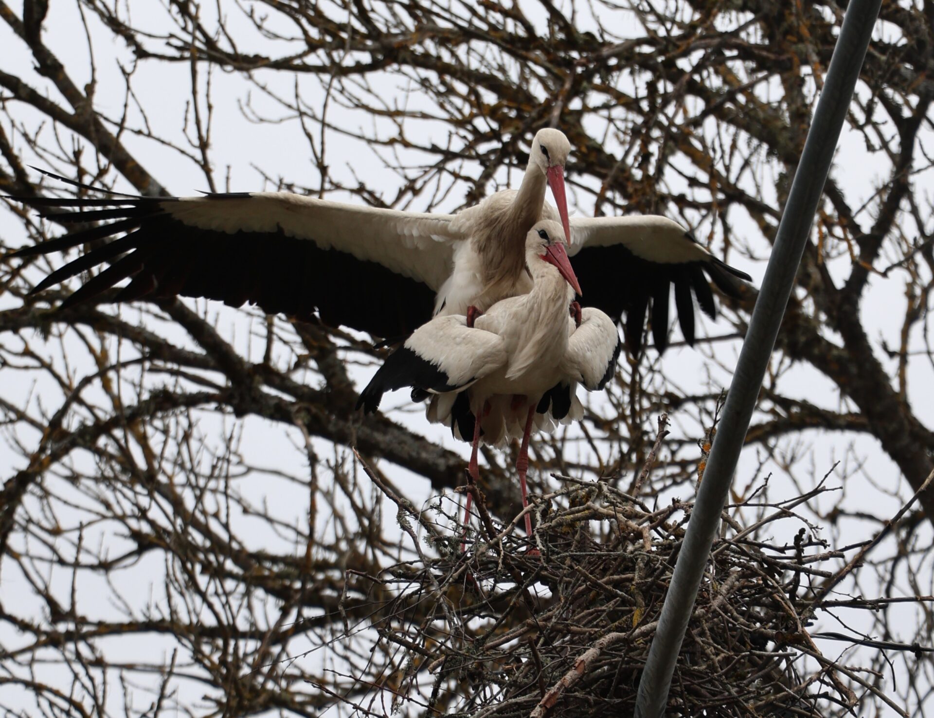 Kui Lääne Elu neljapäeval Nigulas käis, olid kured kahekesi juba uut pesa ehitamas. Üle hoovi laugles lind, nokas oksad, ja maandus pesal oleva kaaslase juurde.