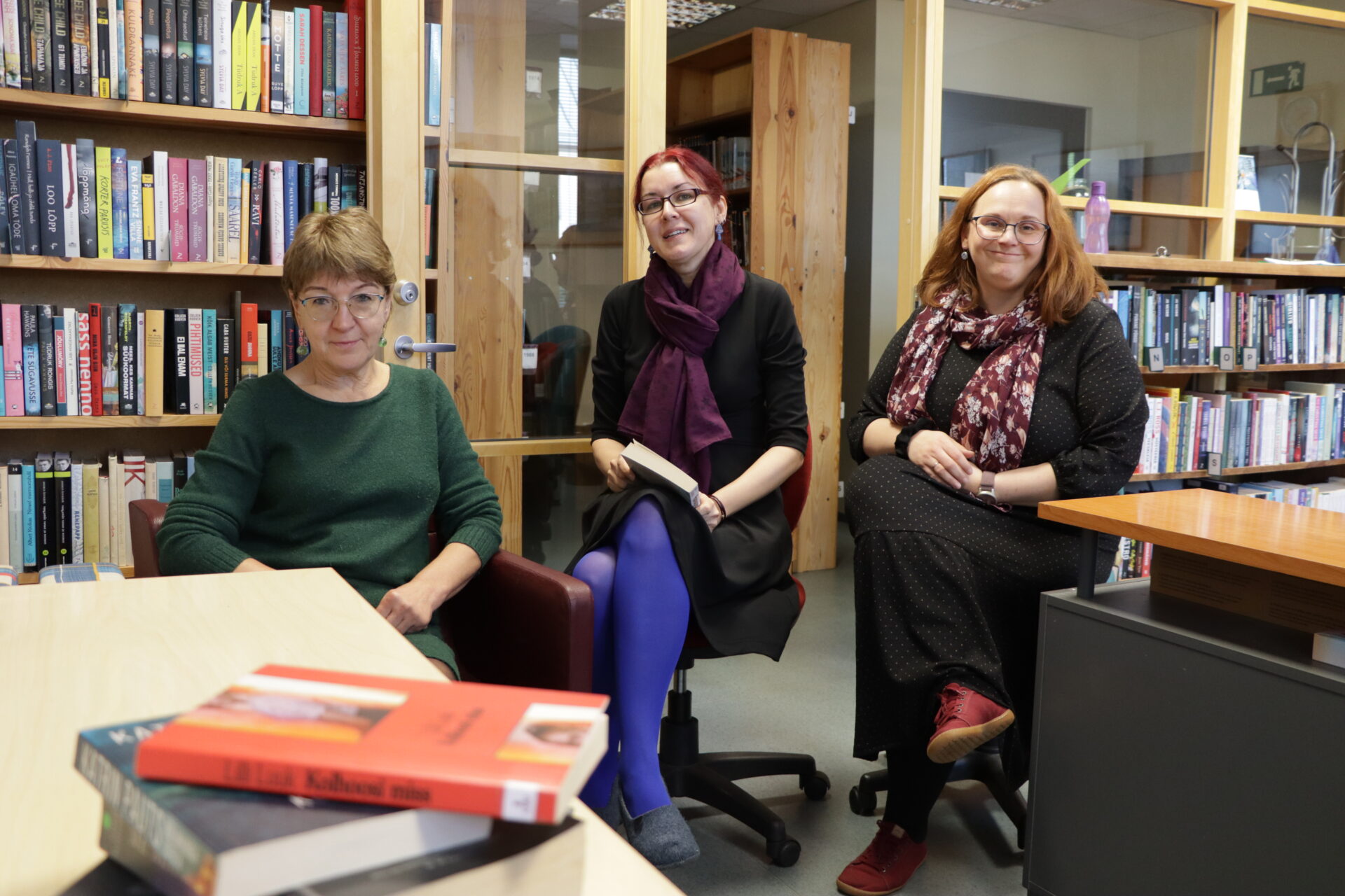 Haapsalu raamatukoguhoidjad Taimi Hein (vasakult), Anželika Lauri ja Anni Kaasik panid 2025. aasta loetumad raamatud ritta. Foto: Andra Kirna[/caption]